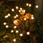 IP65防水のソーラーガーデンライト4個セット。10個のLED電球が自動で点灯/消灯し、風に揺れるデザインがおしゃれ。芝生や通路、テラスにぴったり。