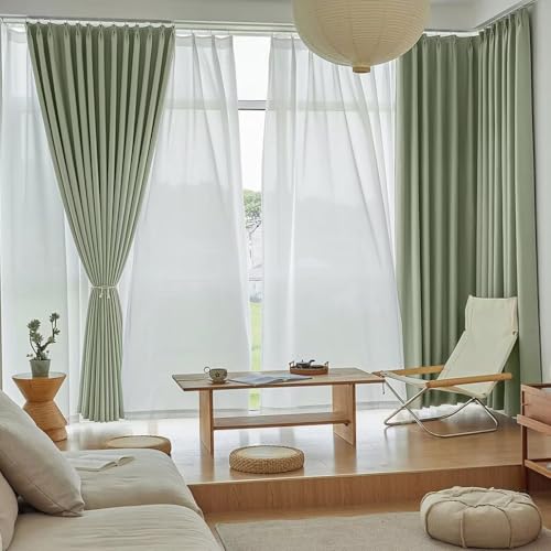YKFNの遮光カーテン2枚組は、1級遮光で200cm丈、幅120cm。断熱・防寒効果があり、おしゃれなデザイン。UVカット、節電対策にも最適で、ミラーレース付きで洗濯可能。アジャスターフックとタッセル付きで、シンプルな北欧スタイルのグリーンです。