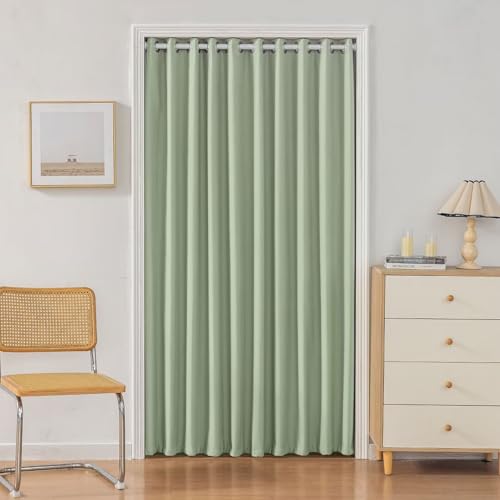 YKFNの間仕切りカーテンは、195cm丈、幅80cmの厚手で1級遮光。防寒・遮音・目隠し機能を備え、冷気を遮断。洗濯可能で北欧デザインのおしゃれなグリーン。ハトメ型で突っ張り棒にも対応、リビングや玄関などに最適。