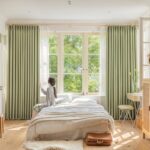 YKFN 1級遮光カーテン4枚セット(カーテン2枚+レース2枚)。サイズは220cm丈、150cm幅。防音・断熱効果あり、UVカット・省エネも特長。洗濯機対応で、アジャスターフック付き。おしゃれなグリーンで寝室や間仕切りに最適。