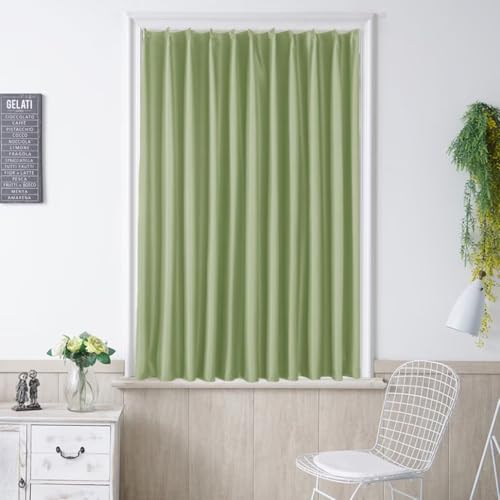 YKFNの遮光カーテンは、小窓用で丈70cm、幅60cmの1枚セット。デザインはシンプルな無地のグリーンで、防音・断熱・保温・遮熱・UVカット機能を備え、昼夜の目隠しに最適。アジャスターフック付で洗える仕様。