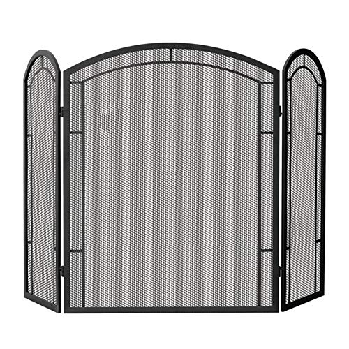 大型アーチ型3パネル暖炉スクリーン。鉄製の屋外用金属装飾メッシュで、ブラックの錬鉄製。火花を防ぎ、安全に暖炉を楽しむためのスパークガードカバーです。