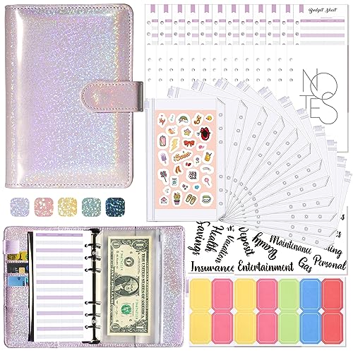 A6バインダー6穴で、ポケット12個付き。便利なラベルセットも含まれ、オシャレなキラキラデザイン。家計管理や書類整理に最適なルーズリーフバインダー(パープル)。