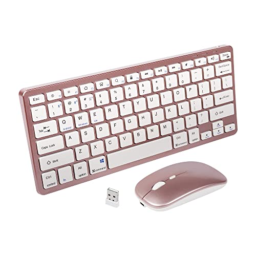 ワイヤレスキーボードマウスセット。Bluetooth&無線2.4G接続対応。iOS、Android、Windows、Chrome、Macに対応。3デバイス切替可能。静音、充電式、超薄型、軽量。英語配列(ローズゴールド)。