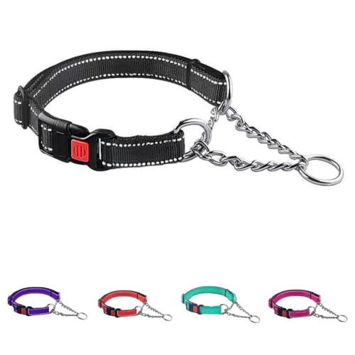 犬用の反射調節可能なフォーク型首輪、ステンレスチェーン付きで引張り訓練に最適。小型から大型犬まで対応可能で、旅行や散歩に便利。迅速解放ボタン付きのファッショナブルなデザイン。