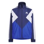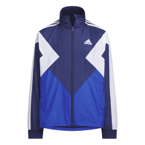 アディダスのユニセックス子供用ジャージトップ。キッズマストハブCBウーブンジャケットは、ダークブルー/チームロイヤルブルー/ホワイトの配色で、サイズ160です。