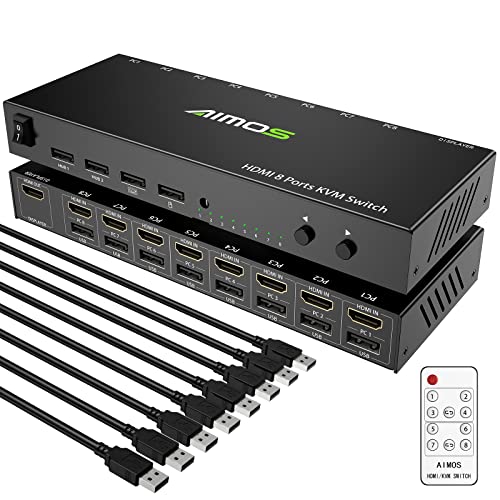 HDMI KVM切替器、8入力1出力、4K@30Hz対応。8台のPCでキーボード、マウス、モニターを共有可能。リモコン付きで簡単操作。