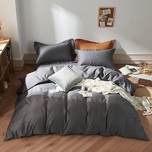 MILDLYのダブル4点セット布団カバーはエジプト超長綿100%使用。掛け布団カバー、ボックスシーツ、枕カバー2枚のセット。300本高密度サテン生地で、洗える保温タイプ。静電気防止加工で快適な睡眠をサポート。カラーはグレー。