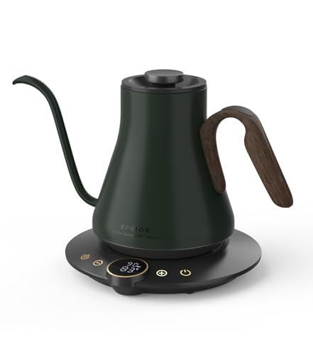 エペイオスの電気ケトルは、1°C単位での温度調節が可能で、細口ドリップでコーヒーを淹れるのに最適。LED表示パネル搭載、0.9Lでコンパクトなデザイン、1040Wのパワーで素早く加熱します。