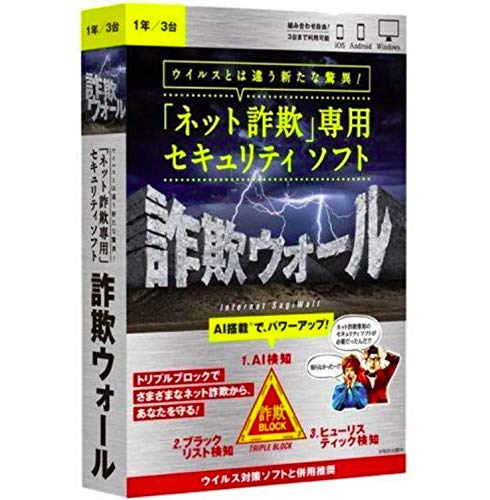 詐欺ウォール 1年3台版は、ネット詐欺対策に特化したソフトウェアです。マルチデバイス対応で、3台まで使用可能。ウイルスとは異なる新たな脅威に対抗し、安全なネット環境を提供します。
