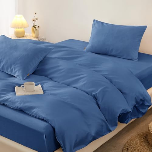 SAPHREAS ダブル4点セットは、100%綿製の掛け布団カバー、ボックスシーツ、枕カバーから成り、セミダブルの洋式・和式布団に対応。肌ざわりが良く、洗い替えも速乾で、四季通用の贅沢品質。ネイビーブルーの色合いが魅力的です。