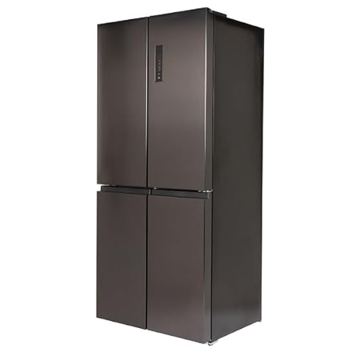 MAXZEN 冷蔵庫 415L 大容量、自動霜取り機能付きで4ドア観音開き。幅79cm、静音設計、ドア閉め忘れアラーム、チルド機能あり。奥行き薄型でコンパクトな黒ガンメタリックモデル。