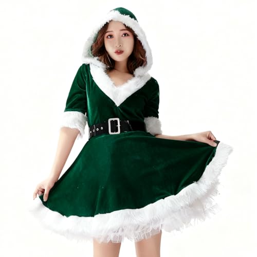 デザインは可愛らしいVネックのサンタクロース衣装。フード付きのワンピースとスカートの2点セット。大きいサイズ(L)もあり、クリスマスパーティーなどに最適なコスプレです。