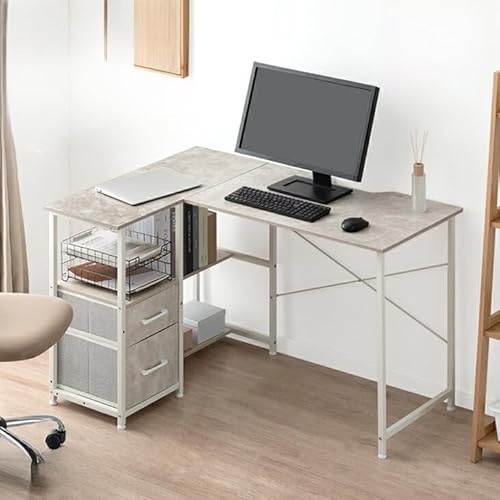 引き出し付きL字型パソコンデスク。幅120cm、左右反転可能。棚付きサイドラックで収納力UP。おしゃれな石目調モルタルホワイトで、在宅ワークやゲーミングにも最適。