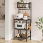 Bestierのレンジラックは幅60cmで、大型電子レンジにも対応。高さ147.8cmで、省スペース設計。可動棚と高耐荷設計、10個のS字フック、アジャスター付きで、使い勝手抜群のブラック食器棚です。