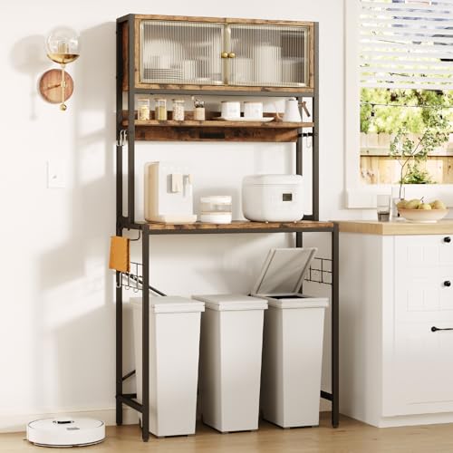 Bestier ゴミ箱上ラックは幅84×奥行40×高さ170cmで、2口コンセント付き。頑丈設計で全体耐荷重84kg、大型電子レンジや炊飯器を収納可能。扉収納やS字フック10個付きの省スペースデザイン。