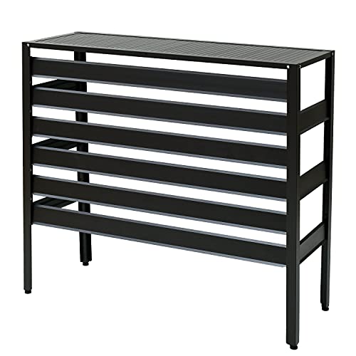 山善のガーデンマスター アルミ エアコン室外機カバーは、幅106×奥行38×高さ97cmの大型タイプで、様々なサイズの室外機に対応。雨風やサビに強いアルミ製のダークブラウンモデルです。