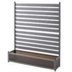 ガーデンマスターのアルミプランターフェンスは、幅120cm、奥行30cm、高さ149cmの目隠しフェンスです。プランターボックスとしても使用でき、日よけ効果もあり、グレーのデザインが特徴です。
