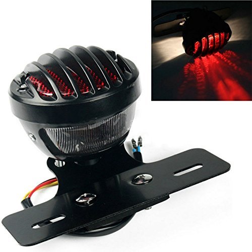 カラウンの12V丸型バードゲージテールランプ。ブラックデザイン、ステー付きで汎用バイクに最適。耐久性に優れ、スタイリッシュな印象を与えます。
