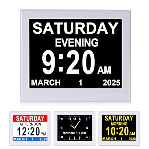 KASTISS 8インチデジタルカレンダーデイクロックは、認知症対応で大きなフォントに日付・時刻・曜日を表示。プログラム可能な薬リマインダー付き。壁掛け可能。