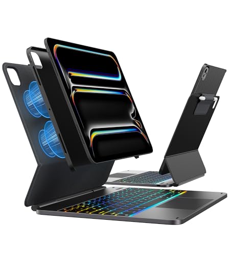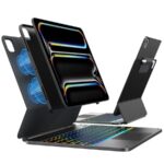 EDGE+ スペースブラックキーボードは、iPad Pro 13インチ(2024 M4トラックパッド対応)用の脱着式スリムカバー。ペンシルホルダー、マグネットスタンド、11色バックライト、ポートレート&タイピングモード搭載。