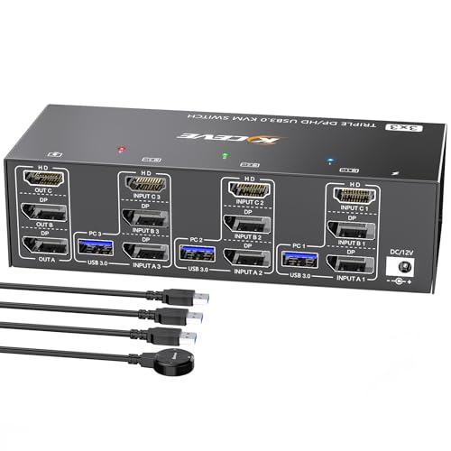 2 DisplayPort + HDMIのKVMスイッチ。3コンピュータ、8K@60Hz、4K@144Hz対応。3モニター接続可。4 USB 3.0ポート付き、KVMケーブル同梱。
