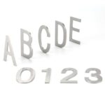 表札ステンレス製の切り文字。フォントはゴシック体で、厚さは2mm。サイズは80mmで、アルファベットと数字の組み合わせが可能です。個性的なデザインで、外部の環境にも耐えられる耐久性があります。