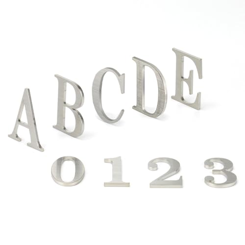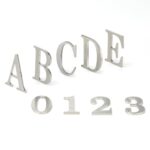 表札はステンレス製で、切り文字の明朝体を採用。厚さは1mm、サイズは40mmで、アルファベットと数字に対応。耐久性に優れ、エレガントなデザインが特長です。