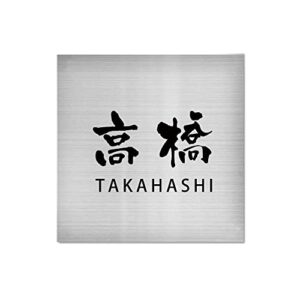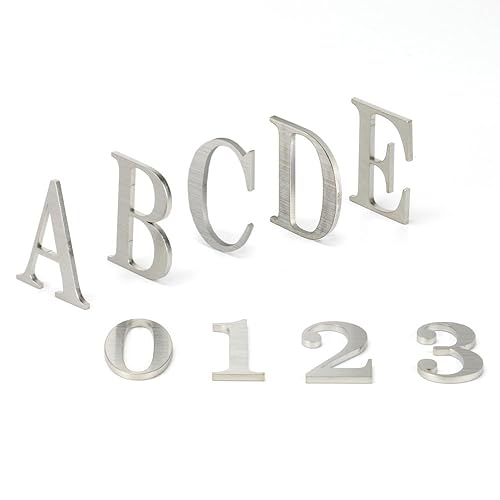 表札はステンレス素材で、切り文字の明朝体デザインです。厚さ2mm、サイズは50mmです。アルファベットや数字の表示に最適で、耐久性と美しさを兼ね備えています。