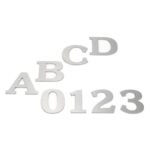 ステンレス製の表札で、切り文字は太明朝体。厚さは2mmで、サイズは30mmのアルファベットや数字に対応。耐久性があり、シャープなデザインが特徴。おしゃれで目を引く表札の作成に最適です。