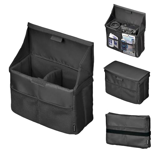 ハクバのフォールディングインナーソフトボックスD ブラックは、カメラやガジェット収納に最適なインナーバッグです。中仕切り付きで取り外し可能なふたがあり、未使用時は折り畳み可能です。