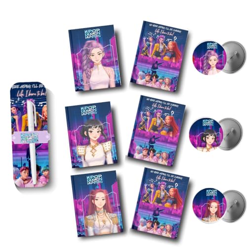 KPOP Huntrixグッズセット。ポケットノート3枚、ボタン3本、ペンが含まれ、アニメテーマのコレクターファンアイテム。ファン必見のアイテムで、デザインも魅力的です。