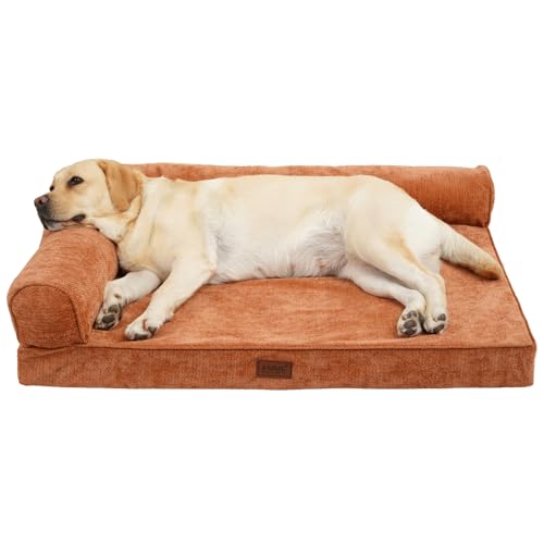 EMMEの耐噛みL型犬用ベッドは、洗えるシェニール生地と防水防傷仕様。中型・大型犬対応、抗菌防臭、滑り止め付きで、ふわふわの枕も付属。サイズは100x80x25cm、キャラメルブラウンのXLサイズ。