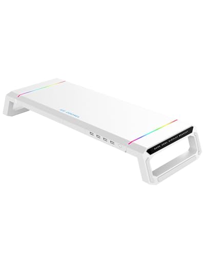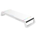 4つのUSBポート付きのモニタースタンド。机上のデスクに置いて、スマホスタンドや引き出しも完備。高みは8CM、RGBライトが魅力。耐荷重25kgでPC作業やゲームにも最適。カラーはホワイト。