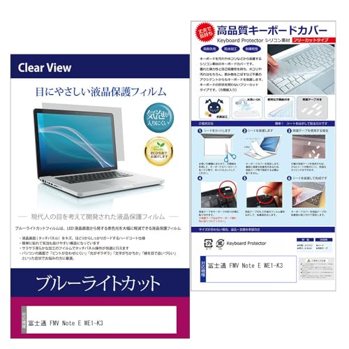 富士通 FMV Note E WE1-K3 向けのシリコン製フリーカットキーボードカバーとブルーライトカット液晶保護フィルムのセット。15.6インチ対応で、視認性向上を図りながら、傷や汚れを防ぐ。