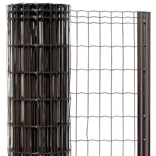 簡単金網フェンス・改良型 1500 ネット+支柱セットは、高さ1.5m、長さ14mのダークブラウン色で、防錆処理とPVC加工が施されています。耐久性があり、設置も容易です。