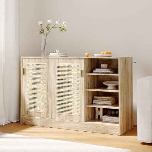 Timecheeラタンサイドボードは、幅120cmのナチュラルな木目調デザインで、スライドドア付きの収納キャビネット。リビングや寝室に最適なおしゃれな収納棚です。