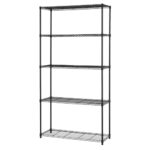 VECELOのスチールラックは、幅90x奥行35x高さ180cmで、各棚板の耐荷重は50KG。防錆加工が施され、キッチンやリビングなどで業務用としても活用できます。シンプルなブラックデザイン。