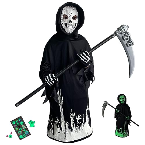 GOKEIの死神コスプレ3点セットは、蛍光効果のあるローブ、マスク、かま、手袋が含まれ、ホラーや仮装に最適です。子供用で、男女兼用、クリスマスや文化祭、パーティーにぴったりです。