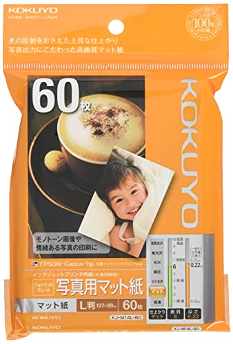 コクヨのインクジェットプリンタ用写真用マット紙L判60枚入り(KJ-M14L-60)。高品質な印刷が可能で、光沢のない仕上がりが特徴。プロの写真撮影にも適しており、耐久性にも優れています。