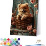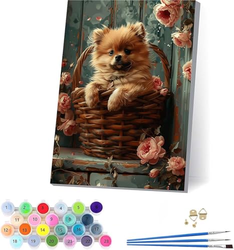 数字油絵キット「犬のペイントバイナンバー」。30x40cmサイズ、花のデザイン。ブラシとアクリル絵の具付き。大人の趣味やギフト、ホーム・オフィス decorに最適。