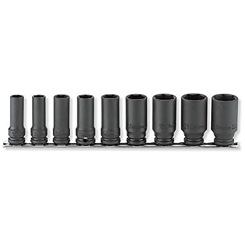 コーケンの3/8インチ(9.5mm)SQ.インパクト6角セミディープソケットレールセットは、薄肉設計で9個のソケットがセットになっています。耐久性が高く、狭いスペースでの作業にも最適です。