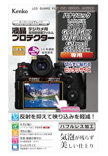 ケンコーの液晶保護フィルム KLP-PAS1RM2は、Panasonic LUMIX S1RⅡ/G99Ⅱ/GH7/S9/G100D/G9PROⅡ/S5Ⅱ/S5Ⅱx用の日本製プロテクターです。高い透明度と耐久性を誇り、ディスプレイをしっかり保護します。