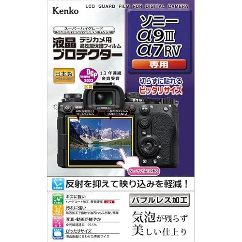 ケンコーの液晶保護フィルムは、SONY α9Ⅲ/α7R V専用設計。防汚コートが施されており、指紋や汚れを防ぎます。日本製で高品質、安心して使用できる液晶プロテクターです。