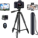 軽量で持ち運び便利な三脚。最大長158cm、5段階伸縮、3WAY雲台、Bluetoothリモコン付き。iPadや一眼レフ対応。自撮りやライブ配信にも最適。日本語取扱書付き。