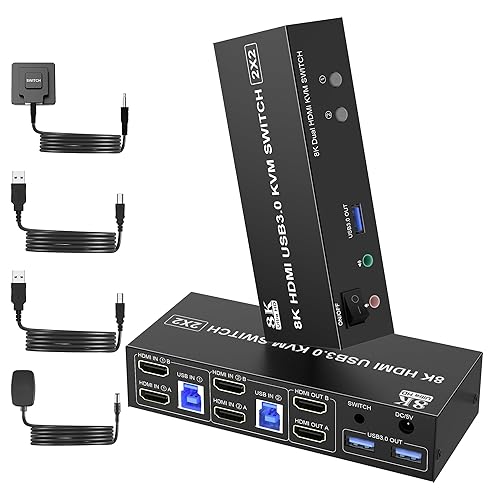2ポートUSB 3.0 HDMIデュアルモニターKVMスイッチ。8K@60Hz対応で高画質映像を切替可能。複数PCを簡単に操作可能。