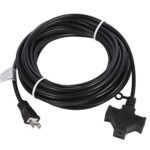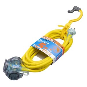KIMOC延長コード5m、3個口の電源ケーブル。屋内外作業に適し、12A、125V、1200W対応。二重被覆で安全性が高く、LEDイルミネーション用にも使用可能。