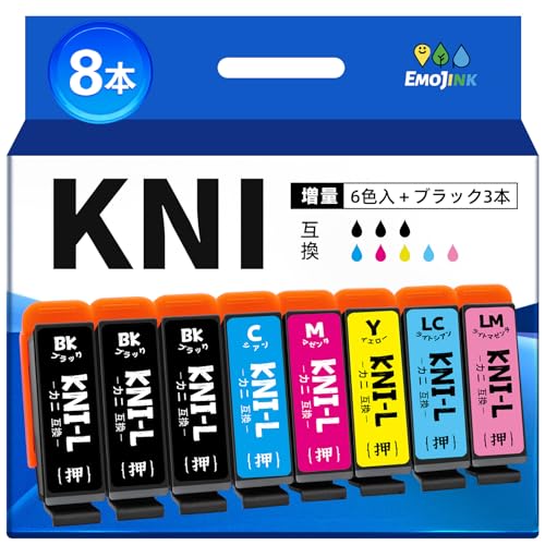 KNI-6CL-LはEPSON用の互換インクカートリッジで、KNI-6CLシリーズには6色と黒2本の計8本が含まれています。増量タイプで残量検知に対応。EP-887AB、EP-887AP、EP-887AWプリンターに適合。