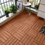 ウッドパネルセット(15枚、30×30cm、厚み2cm)。人工木樹脂製で、腐らず屋外・屋内で使用可。ジョイント式で簡単設置、1.35平米分。ダークブラウン色。