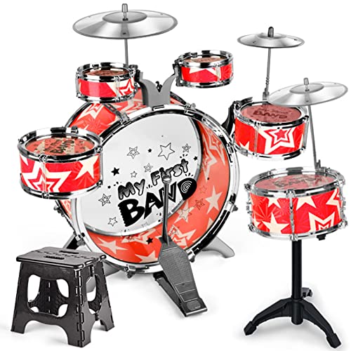 KONGNYキッズドラムセットは、6ピースのジャズドラムキット。折りたたみステップスツール、シンバルペダル、ドラムスティック付きで、初心者や子供に最適なパーカッション楽器です。